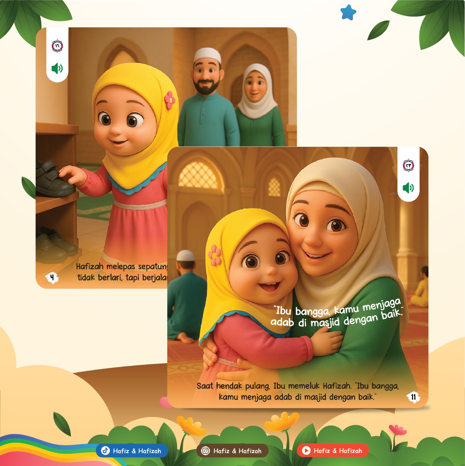 Hafizah dan Adab di Masjid adalah kisah indah tentang Hafizah, seorang anak yang belajar menjaga sikap saat berada di rumah Allah. Melalui bimbingan Ayah dan Ibu, Hafizah memahami pentingnya bersikap sopan, tenang, dan penuh hormat di masjid.