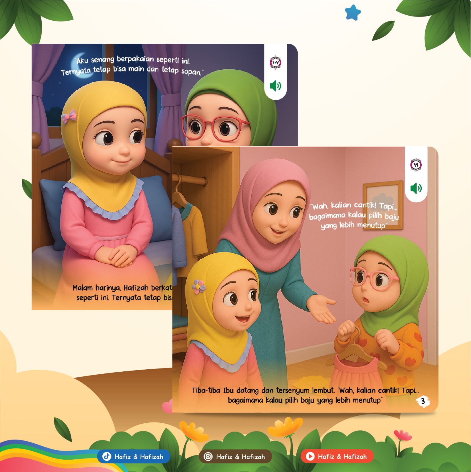 Dengan hati gembira, Hafizah dan Humairah memilih baju yang menutup aurat namun tetap nyaman dan indah. Cerita ini mengajarkan anak-anak pentingnya berpakaian dengan sopan, rapi, dan sesuai adab Islam tanpa kehilangan keceriaan.